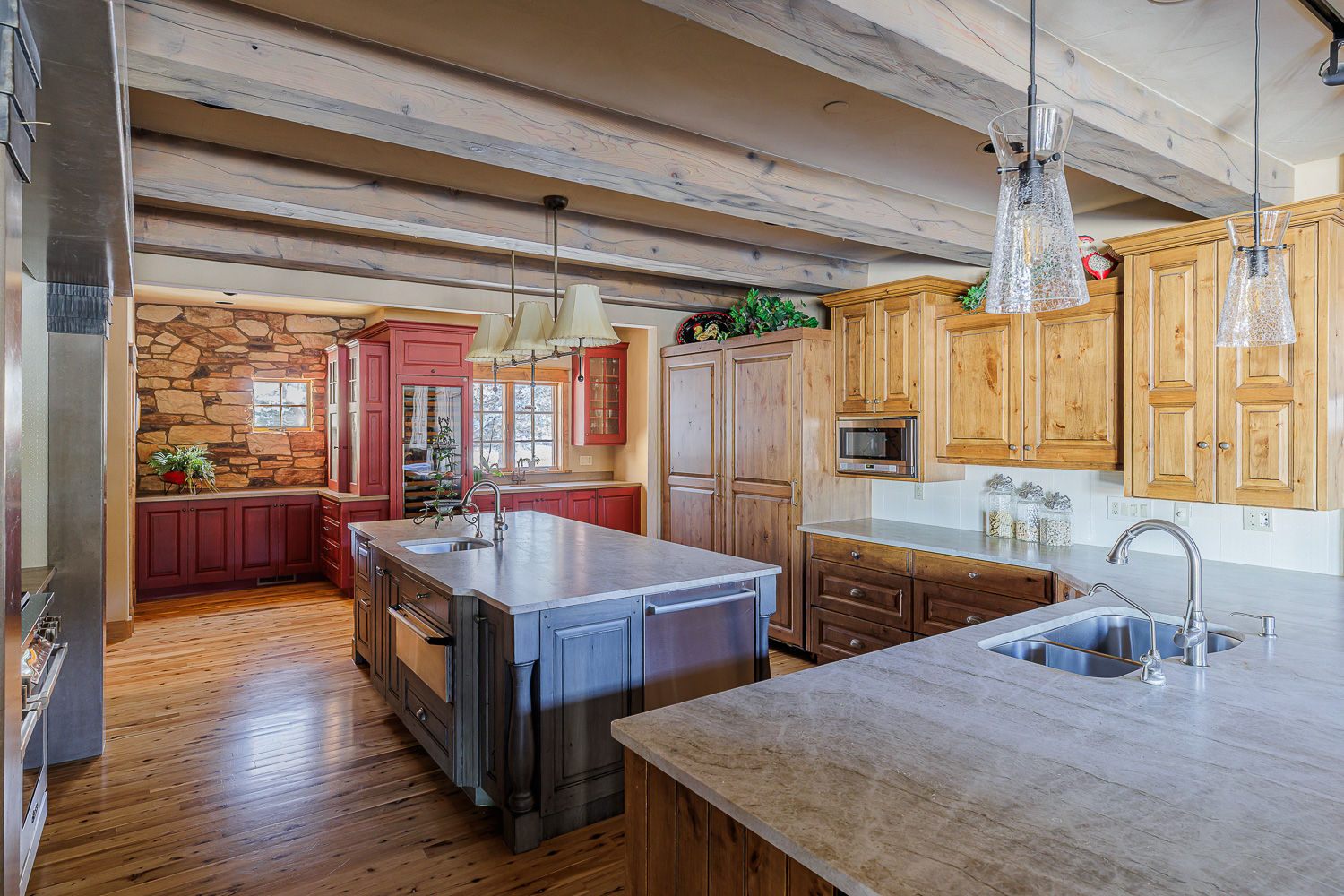 Inside, you'll find soaring ceilings, wide hallways, handcrafted millwork, intricate tile and a seamless blend of stone, wood, and iron elements. The main level features a sun-drenched great room with a dramatic stone fireplace, formal and casual dining spaces, a private office, and a chef's kitchen with top-of-the-line appliances, a generous center island, and butler's pantry. The main level primary suite includes a spa-like bath, dual walk-in closets, fireplace, and views.
